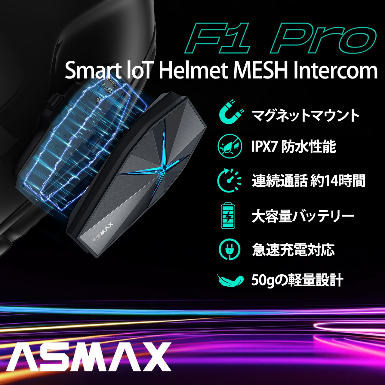 ■声で操る、新しい操作体験 F1 Proは、スマートフォンの音声アシスタントだけでなく、ネット環境がなくても使えるオフライン音声コマンドを搭載。 「Hi Max」と呼びかけるだけで、音楽再生・音量調整・チーム作成など、ライディングに必要な操作をハンズフリーで実行できます。 例えば、仲間と一斉に会話したい時は「Hi Max/フリーモード」と話しかけるだけ。 最大10人同時通話が、ボタン操作なしで始まります。 ■メッシュ通信で“切れないつながり Bluetooth 5.3デュアルチップと独自アルゴリズムにより、最大3kmの通信距離を実現。 ライダーが隊列を離れても自動で再接続するメッシュ型通話に対応し、大人数ツーリングでも安定したクリアな会話を楽しめます。 ■高音質設計で音楽も会話も進化 ASMAXオリジナル40mmスピーカーとBongiovi Acoustic Labsによる音響チューニングで、迫力と臨場感あるサウンドを提供。 さらにENC(環境ノイズキャンセリング)を搭載し、風切り音や周囲の雑音を抑制。 仲間との会話も、音楽再生も、クリアで快適なライディング環境を約束します。 ■アプリで広がる機能とアップデート 専用アプリ「ASMAX WORLD」を使えば、グループ管理、ファームウェア更新、設定カスタマイズが簡単に可能。 OTA(Over The Air)に対応しており、購入後も新機能を継続的に追加できます。 「買った後に進化するインカム」こそ、F1 Proの大きな魅力です。 ■使いやすさと安心感 ・マグネットマウントでワンタッチ着脱 ・1350mAhバッテリーで最大14時間連続通話 ・USB Type-C急速充電(15V以下推奨) ・IPX7相当の防水性能で雨天走行も安心 ・他社インカムとも接続できるユニバーサルペアリング対応 ・購入日から2年間の安心保証付き ■ご利用の前に ・商品到着後は、OTAアップデートとアプリのバージョン更新を必ず行ってください。 ・充電には15V以下の充電器をご使用ください。過電圧充電は故障の原因となります。 ASMAX F1 Proは、音声操作・メッシュ通信・高音質を兼ね備えた、ライダーのための新世代インカムです。 「仲間との会話をもっと自由に、もっと快適に」その想いを形にした一台を、ぜひ体感してください。