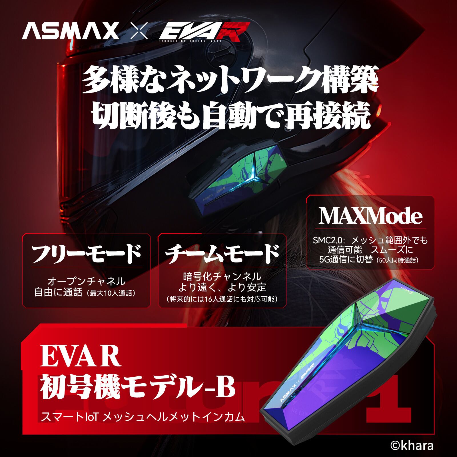 【ASMAX × EVANGELION RACING】 次世代スマート・インカム「EVA R モデル」11/1発売—CloudTalkで最大50人&他社接続も楽々簡単! ASMAXとEVANGELION RACINGの公式コラボレーションによる次世代スマートインカム「EVA R モデル」が、カスタムジャパンによる日本国内の総販売代理店契約のもと、2025年11月1日に発売されます。 エヴァンゲリオン初号機・2号機をモチーフにした全4モデル(初号機A/B、2号機A/B)が登場予定しました。 「EVANGELION RACING」は、『ヱヴァンゲリヲン新劇場版』とのプロモーションタイアップにより誕生した実在のレーシングチームです。2010年にラナ エンタテインメントが企画・運営を開始し、2輪では鈴鹿8耐、4輪ではSUPER GTやスーパー耐久など、国内外の人気モータースポーツで活躍。 EVA R モデルは、このチームの世界観と実車で培われたレーシングDNAをヘルメットギアに落とし込んだ公式モデルです。初号機・2号機の象徴的な配色とLEDカラーリングが、ナイトランでも圧倒的な存在感を放ちます。 ■声で操る、新しい操作体験 ASMAX×EVA R コラボモデルは、スマートフォンの音声アシスタントだけでなく、ネット環境がなくても使えるオフライン音声コマンドを搭載。 「Hi Max」と呼びかけるだけで、音楽再生・音量調整・チーム作成など、ライディングに必要な操作をハンズフリーで実行できます。 例えば、仲間と一斉に会話したい時は「Hi Max/フリーモード」と話しかけるだけ。 最大10人同時通話が、ボタン操作なしで始まります。 ■メッシュ通信で切れないつながり Bluetooth 5.4デュアルチップと独自アルゴリズムにより、最大3kmの通信距離を実現。 ライダーが隊列を離れても自動で再接続するメッシュ型通話に対応し、大人数ツーリングでも安定したクリアな会話を楽しめます。 ■高音質設計で音楽も会話も進化 ASMAXオリジナル40mmスピーカーとBongiovi Acoustic Labsによる音響チューニングで、迫力と臨場感あるサウンドを提供。 さらにENC(環境ノイズキャンセリング)を搭載し、風切り音や周囲の雑音を抑制。 仲間との会話も、音楽再生も、クリアで快適なライディング環境を約束します。 ■アプリで広がる機能とアップデート 専用アプリ「ASMAX WORLD」を使えば、グループ管理、ファームウェア更新、設定カスタマイズが簡単に可能。 OTA(Over The Air)に対応しており、購入後も新機能を継続的に追加できます。 ■使いやすさと安心感 ・マグネットマウントでワンタッチ着脱 ・1350mAhバッテリーで最大14時間連続通話 ・USB Type-C急速充電(15V以下推奨) ・IPX7相当の防水性能で雨天走行も安心・他社インカムとも接続できるユニバーサルペアリング対応 ・購入日から2年間の安心保証付き ■ご利用の前に ・商品到着後は、OTAアップデートとアプリのバージョン更新を必ず行ってください。 ・充電には15V以下の充電器をご使用ください。過電圧充電は故障の原因となります。 ASMAX×EVA R コラボモデルは、音声操作・メッシュ通信・高音質を兼ね備えた、ライダーのための新世代インカムです。 「仲間との会話をもっと自由に、もっと快適に」その想いを形にした一台を、ぜひ体感してください。