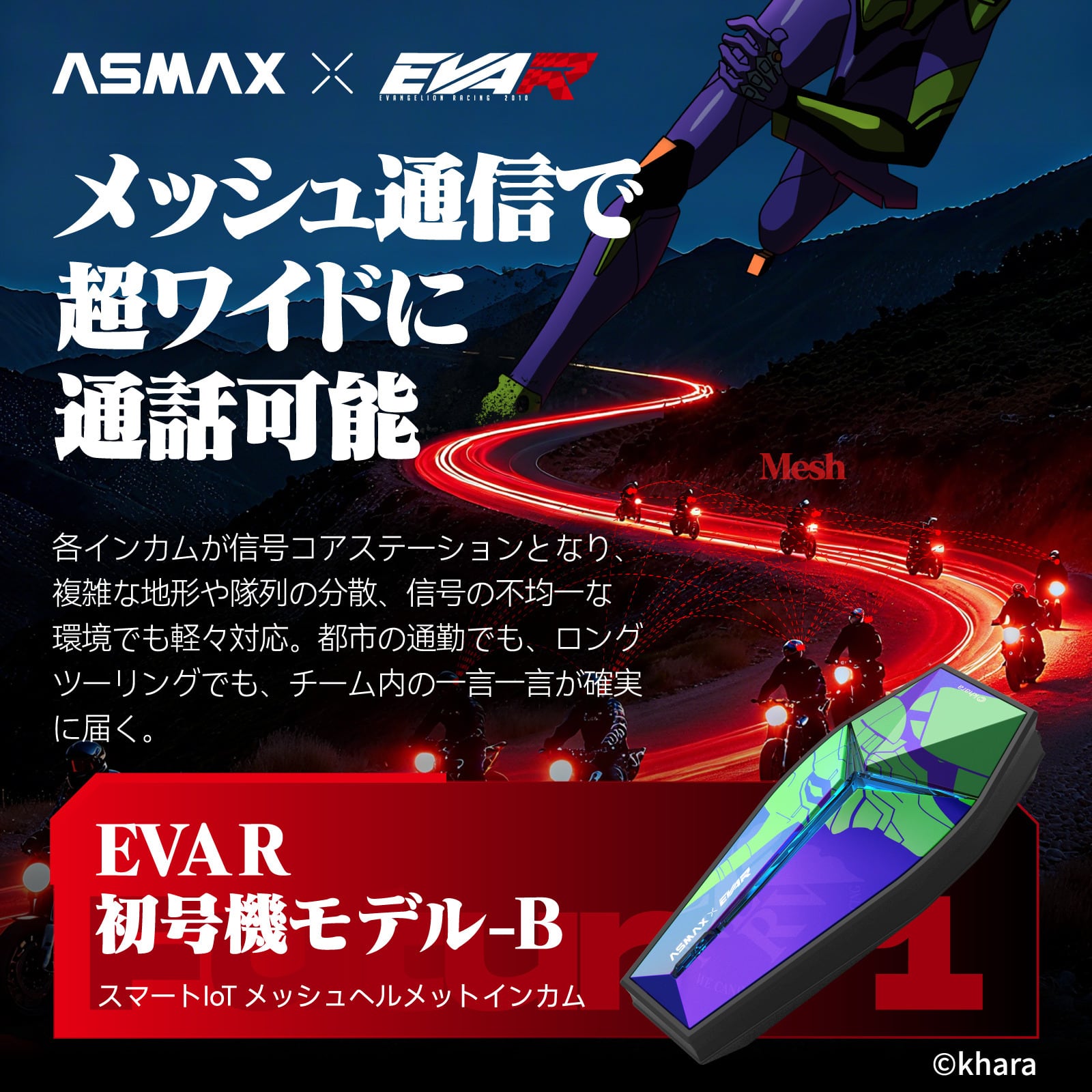 【ASMAX × EVANGELION RACING】 次世代スマート・インカム「EVA R モデル」11/1発売—CloudTalkで最大50人&他社接続も楽々簡単! ASMAXとEVANGELION RACINGの公式コラボレーションによる次世代スマートインカム「EVA R モデル」が、カスタムジャパンによる日本国内の総販売代理店契約のもと、2025年11月1日に発売されます。 エヴァンゲリオン初号機・2号機をモチーフにした全4モデル(初号機A/B、2号機A/B)が登場予定しました。 「EVANGELION RACING」は、『ヱヴァンゲリヲン新劇場版』とのプロモーションタイアップにより誕生した実在のレーシングチームです。2010年にラナ エンタテインメントが企画・運営を開始し、2輪では鈴鹿8耐、4輪ではSUPER GTやスーパー耐久など、国内外の人気モータースポーツで活躍。 EVA R モデルは、このチームの世界観と実車で培われたレーシングDNAをヘルメットギアに落とし込んだ公式モデルです。初号機・2号機の象徴的な配色とLEDカラーリングが、ナイトランでも圧倒的な存在感を放ちます。 ■声で操る、新しい操作体験 ASMAX×EVA R コラボモデルは、スマートフォンの音声アシスタントだけでなく、ネット環境がなくても使えるオフライン音声コマンドを搭載。 「Hi Max」と呼びかけるだけで、音楽再生・音量調整・チーム作成など、ライディングに必要な操作をハンズフリーで実行できます。 例えば、仲間と一斉に会話したい時は「Hi Max/フリーモード」と話しかけるだけ。 最大10人同時通話が、ボタン操作なしで始まります。 ■メッシュ通信で切れないつながり Bluetooth 5.4デュアルチップと独自アルゴリズムにより、最大3kmの通信距離を実現。 ライダーが隊列を離れても自動で再接続するメッシュ型通話に対応し、大人数ツーリングでも安定したクリアな会話を楽しめます。 ■高音質設計で音楽も会話も進化 ASMAXオリジナル40mmスピーカーとBongiovi Acoustic Labsによる音響チューニングで、迫力と臨場感あるサウンドを提供。 さらにENC(環境ノイズキャンセリング)を搭載し、風切り音や周囲の雑音を抑制。 仲間との会話も、音楽再生も、クリアで快適なライディング環境を約束します。 ■アプリで広がる機能とアップデート 専用アプリ「ASMAX WORLD」を使えば、グループ管理、ファームウェア更新、設定カスタマイズが簡単に可能。 OTA(Over The Air)に対応しており、購入後も新機能を継続的に追加できます。 ■使いやすさと安心感 ・マグネットマウントでワンタッチ着脱 ・1350mAhバッテリーで最大14時間連続通話 ・USB Type-C急速充電(15V以下推奨) ・IPX7相当の防水性能で雨天走行も安心・他社インカムとも接続できるユニバーサルペアリング対応 ・購入日から2年間の安心保証付き ■ご利用の前に ・商品到着後は、OTAアップデートとアプリのバージョン更新を必ず行ってください。 ・充電には15V以下の充電器をご使用ください。過電圧充電は故障の原因となります。 ASMAX×EVA R コラボモデルは、音声操作・メッシュ通信・高音質を兼ね備えた、ライダーのための新世代インカムです。 「仲間との会話をもっと自由に、もっと快適に」その想いを形にした一台を、ぜひ体感してください。